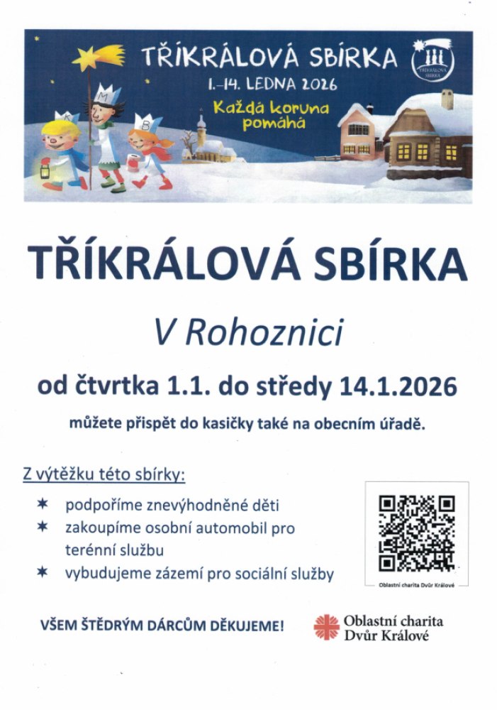 V Rohoznici od čtvrtka 1.1. do středy 14.1.2026 můžete přispět do kasičky také na obecním úřadě a v obchodě Hruška.